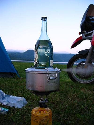 北海道初日の夕べ、洞爺湖畔にて自炊中。日本酒の瓶はお釜の重し代わり。