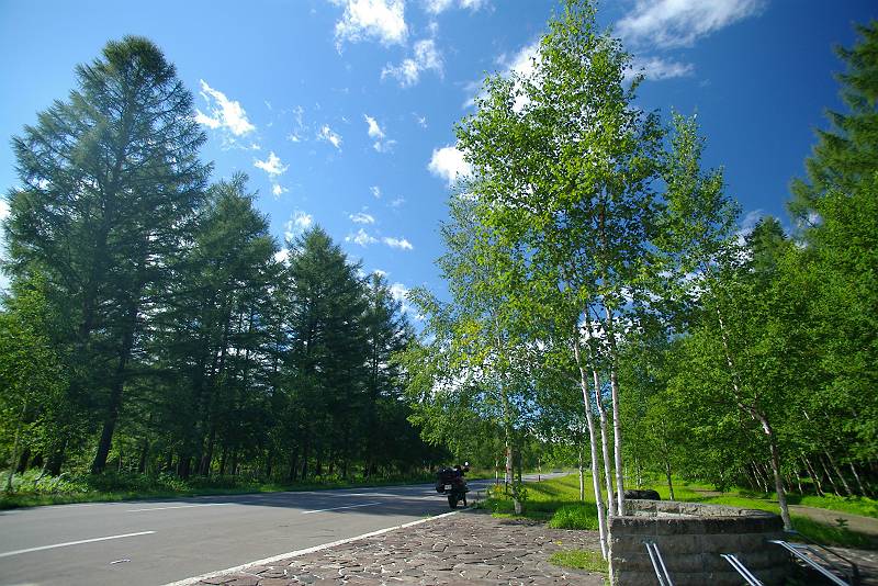 美瑛の市街地から白金キャンプ場へつづく白樺街道。美瑛滞在中、この道を毎日走った。晴れていると最高に気持ちがいい。
