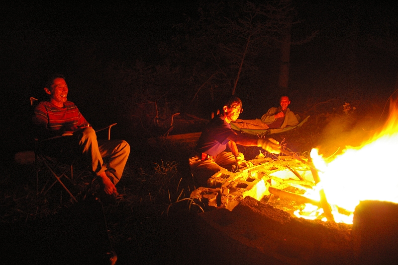 友人ミタヤン邸で、深夜の焚き火に興じる。伐採した松の枝を燃やしているので、異常に火勢が強い (あまりの火の激しさに、笑ってしまっているのだ)