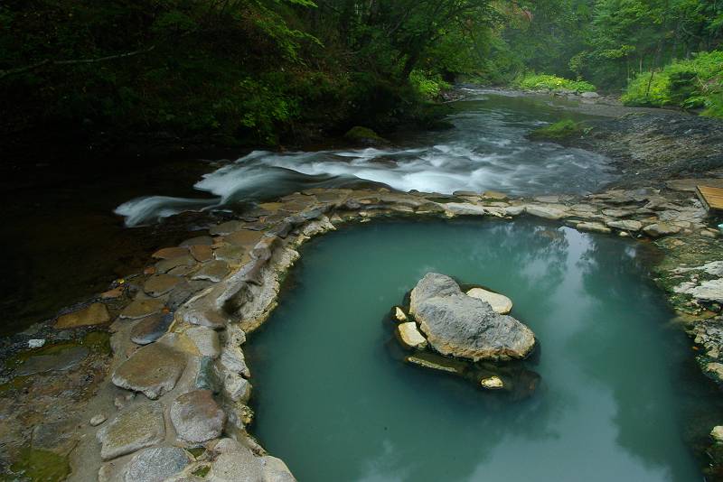 鹿の湯。無料の露天風呂。国設然別峡キャンプ場に隣接しており、いつでも好きな時に入ることができる。