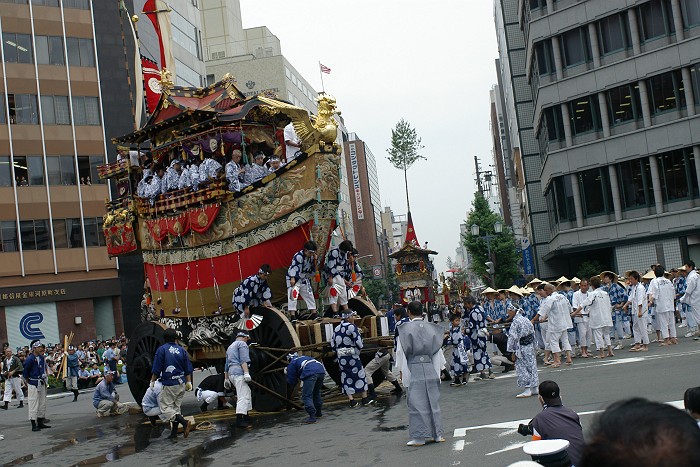 昨日見学した船鉾がようやくやってきて、辻回しをはじめた。車輪の下に竹を敷き、水を大量にまいて、一気に方向転換を行う。