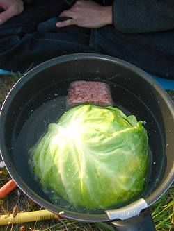 キャンプ場に戻り、キャベツをそのまんま鍋に放り込み、